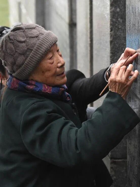 2018年12月10日,在侵华日军南京大屠杀遇难同胞纪念馆举行的死难者遗属家祭活动中,夏淑琴给遇难者名单墙上亲人的名字添漆。(图片来源:新华社)
