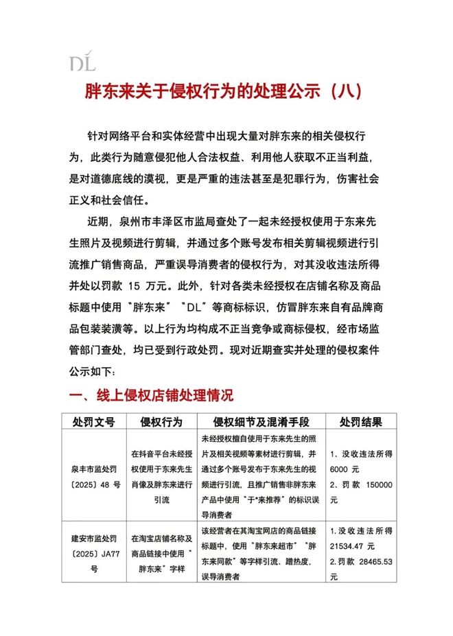9月4日晚,胖东来抖音账号发布《胖东来关于侵权行为的处理公示(八)》。内容显示,近期,福建省泉州市丰泽区市监局查处了一起侵权案件,其行为为未经授权使用于东来照片及视频进行剪辑,并通过多个账号发布视频引流、推广销售商品,严重误导消费者,泉州市丰泽区市监局没收其违法所得并处以罚款15万元。![]()