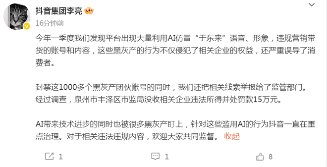 9月8日,抖音集团副总裁李亮在微博发文称:今年一季度我们发现平台出现大量利用AI仿冒“于东来”语音、形象,违规营销带货的账号和内容,这些黑灰产的行为不仅侵犯了相关企业的权益,还严重误导了消费者。封禁这1000多个黑灰产团伙账号的同时,我们还把相关线索举报给了监管部门。