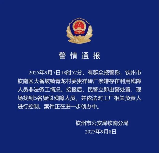 广西钦州市公安局钦南分局发布警情通报:2025年9月7日18时52分,有群众报警称,钦州市钦南区大番坡镇青龙村委贵祥砖厂涉嫌存在利用残障人员非法务工情况。接报后,民警立即出警处置,现场找到5名疑似残障人员,并依法对工厂相关负责人进行控制。案件正在进一步侦办中。