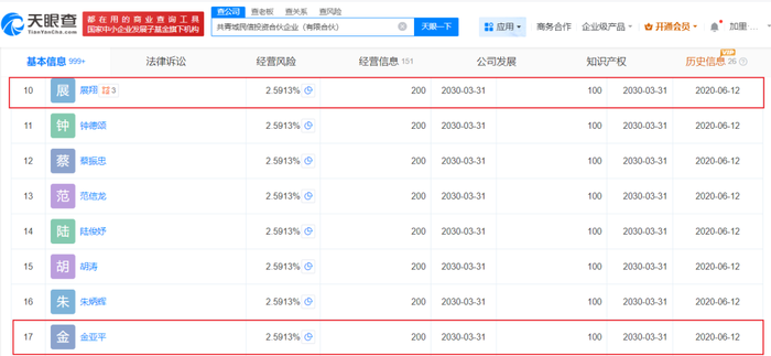 独角金融通过天眼查注意到,此次被罚的展翔和金亚平,还共同出现在名为共青城民信投资合伙企业(有限合伙)(下称“共青城民信投资”)的股东名单中,该公司成立于2020年4月,同年6月二者均成为公司股东,持股比例均为2.59%。