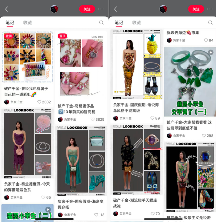 在“负家千金”被送上微博热搜之前,她的创作生涯早就在小红书开启。只不过,她的往期内容侧重时尚生活,主要是向粉丝展示当初冲动消费买来的各种“战利品”,带领网友重温“经济上行”的残影。