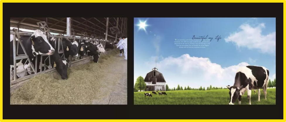 他表示,一般印在牛奶盒上或者看牛奶广告的时候,最常出现的一定是右边这张图,奶牛在户外的青青草地上吃草。