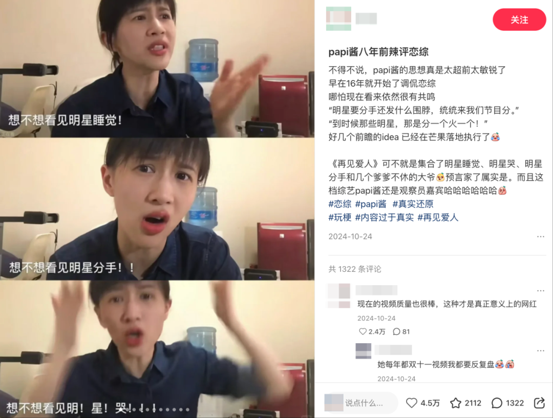 但,就像《再见爱人》播出大火后,大众才慢慢反刍到 papi 酱思想的“超前性”一样,直到以李佳琦、薇娅为代表的直播电商“黄金时代”逐渐落幕,许多人才意识到:papi 酱在内容创作和人物魅力上的优势,完美契合了当下“内容为王”的电商需求。