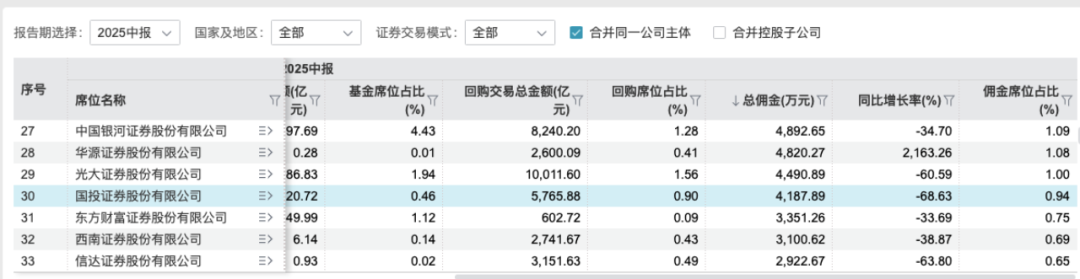 而到了2024年,国投证券分仓佣金收入仅1.96亿元,同比下降43.74%,行业排名第23位;2025年上半年分仓佣金收入0.42亿元,同比下滑68.63%,行业排名第30位。
