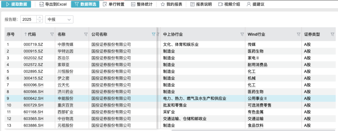 Wind数据显示,截至2025年二季度末。国投证券重仓了13只股票,其中8只属于制造业,包括华特达因(000915.SZ)、苏泊尔(002032.SZ)、索菲亚(002572.SZ)、川恒股份(002895.SZ)、伊之密(300415.SZ)、云天化(600096.SH)、济川药业(600566.SH)、元祖股份(603886.SH)。
