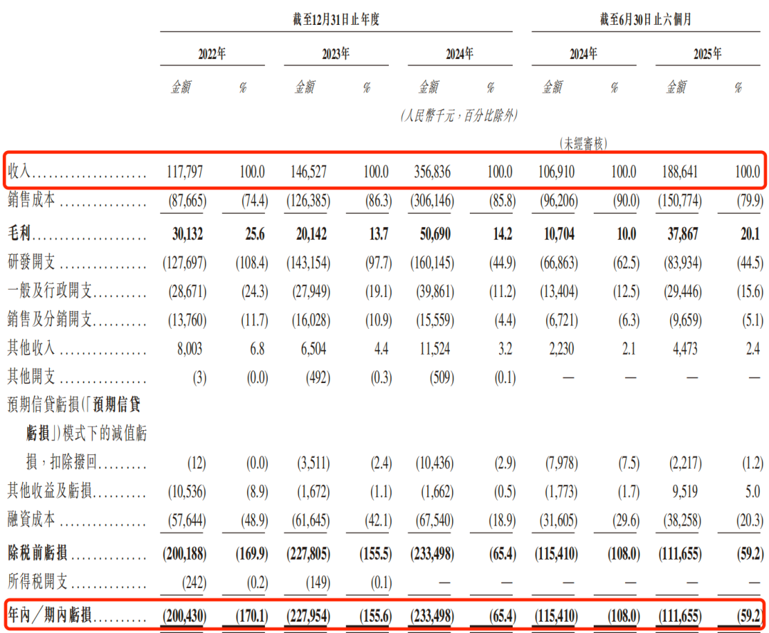 2022年至2025年6月30日(以下简称“报告期”),魔视智能的收入分别为1.18亿元、1.47亿元、3.57亿元和1.89亿元;年内亏损金额分别为2亿元、2.28亿元、2.33亿元和1.12亿元,累计亏损7.74亿元。