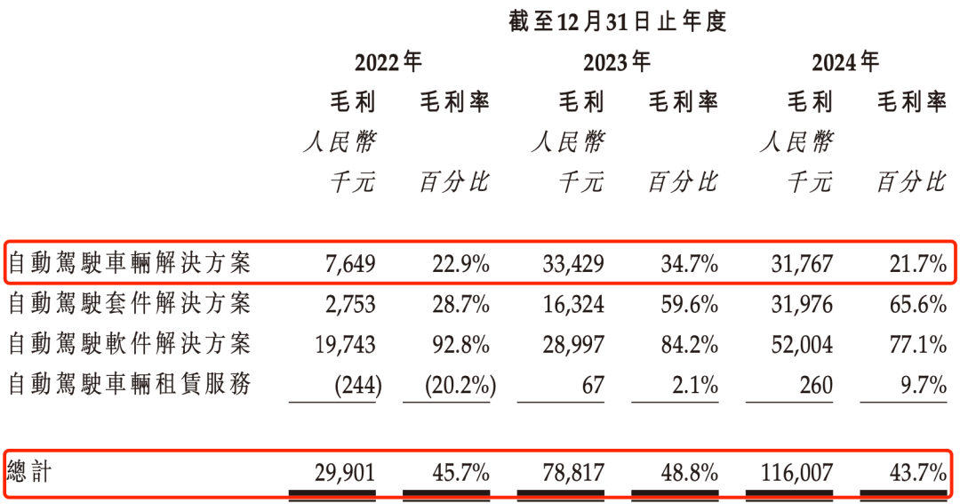 2022年至2024年,驭势科技的综合毛利率高达45.7%、48.8%和43.7%。