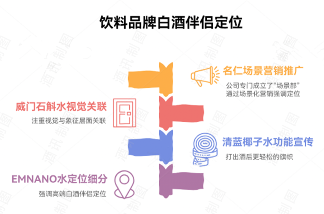 清蓝椰子水则打出了“清蓝椰子水,酒后更轻松”的旗帜,同时强调自身清香的口感特点;EMNANO低赫兹永活水则更进一步细分,强调了“高端白酒伴侣”的定位。