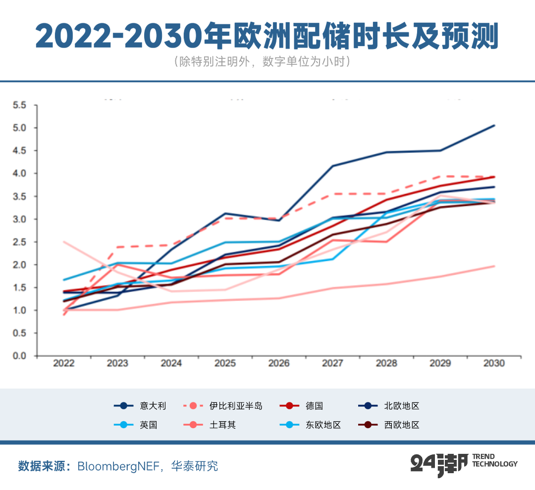 实际上,随着欧洲新能源并网比例的增加,电力系统对灵活调节能力的需求不断上升,凸显长时储能需求,欧洲大储项目的配储时长自2022年以来逐步延长。根据BloombergNEF预测,到2030年,意大利的配储时长将达约5.1小时,相比2024年的2.3小时增长一倍以上。较长的配储时长使储能系统能够更有效地应对电力需求高峰和低谷,提升系统的盈利潜力。