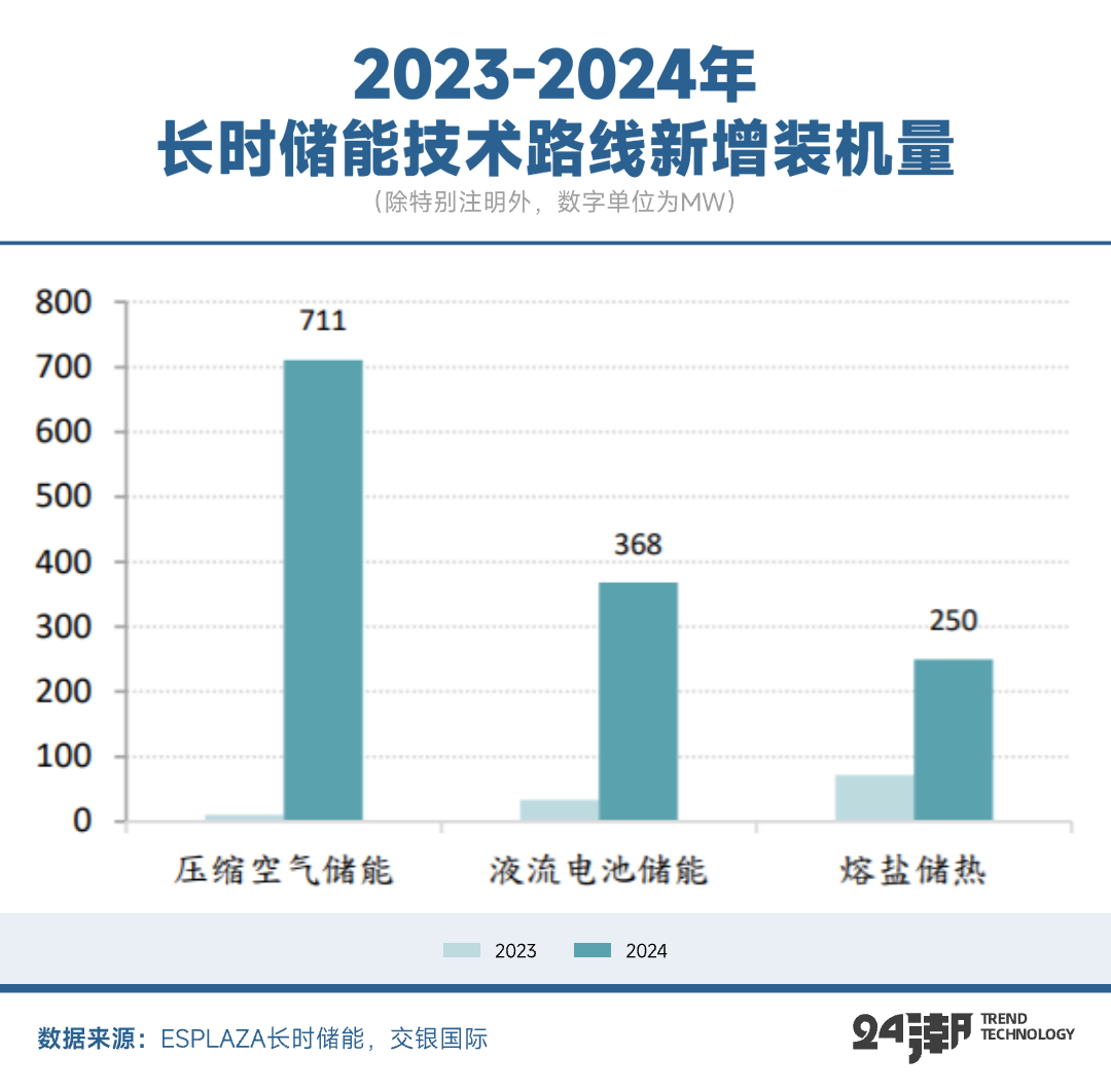 事实也确实如此。根据ESPLAZA长时储能数据库统计,截至2024年底,内地新型长时储能累计装机达2.3GW ,2024年实现新增新型长时储能并网/投运装机规模约1.3GW/8.1GWh。其中,压缩气体储能新增装机规模同比增长超70倍至711MW,容量占比约53%;液流电池增长超10倍至368MW,容量占比约28%;熔盐储能增长250%至250MW,容量占比约19%。