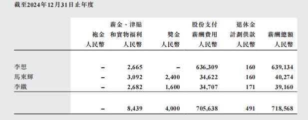 雷达财经查阅发现,“6.8亿港元”的出处来自于理想汽车2024年年报,换算成人民币为6.39亿元,包含266.5万元薪金津贴、16 万元退休金计划供款以及6.36亿元股份支付薪酬。