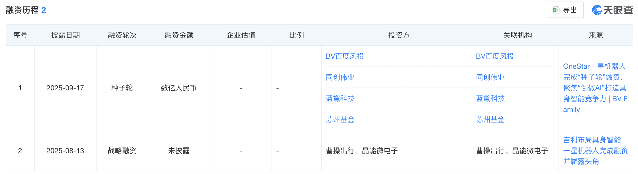 就在公司“猝死”的前一个月,一星机器人还刚刚收获了金额达数亿元的种子轮融资。投资方包括天眼查显示,投资方包括BV百度风投、同创伟业、蓝黛科技、苏州基金。