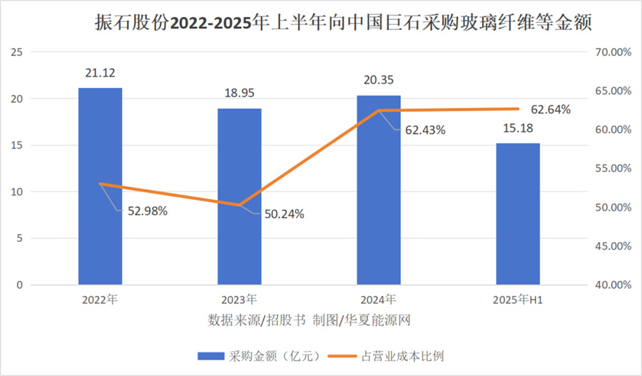 2022年到2025年上半年,振石股份向中国巨石的玻璃纤维等采购金额分别为21.12亿元、18.95亿元、20.35亿元和15.18亿元,占营业成本的52.98%、50.24%、62.43%、62.64%。这意味着,振石股份每花1块钱,就有6毛钱流向了中国巨石。