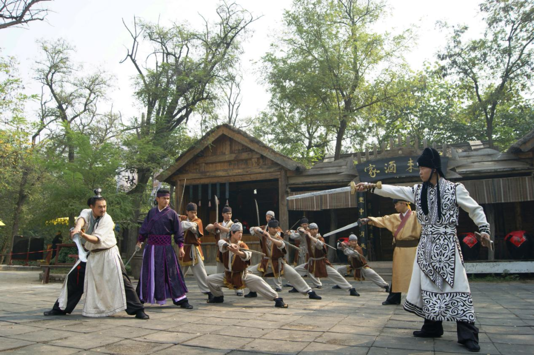 以河南开封万岁山武侠城为例,景区内有约2000名演员各自扮演不同的NPC,而每日互动演出超过3000场。当游客走近NPC时即可触发互动,游客还可以和他们斗舞、合影或是参与小游戏赢得“银票”,而“银票”又可以在景区内购买或者兑换相应的商品。
