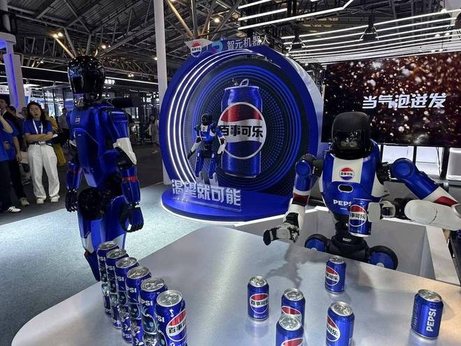 百事可乐的展台更具吸睛网感,直接带着蓝色“人形机器人天团”入展——和智元机器人联合打造的两个人形机器人百事酷宝(首次亮相)、百事蓝宝成为来访者互动打卡的焦点。这两款机器人搭载多模态交互系统,通过语音、表情甚至肢体动作能够与观众唠嗑、拍照合影。