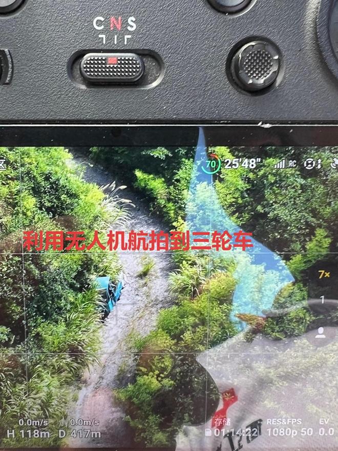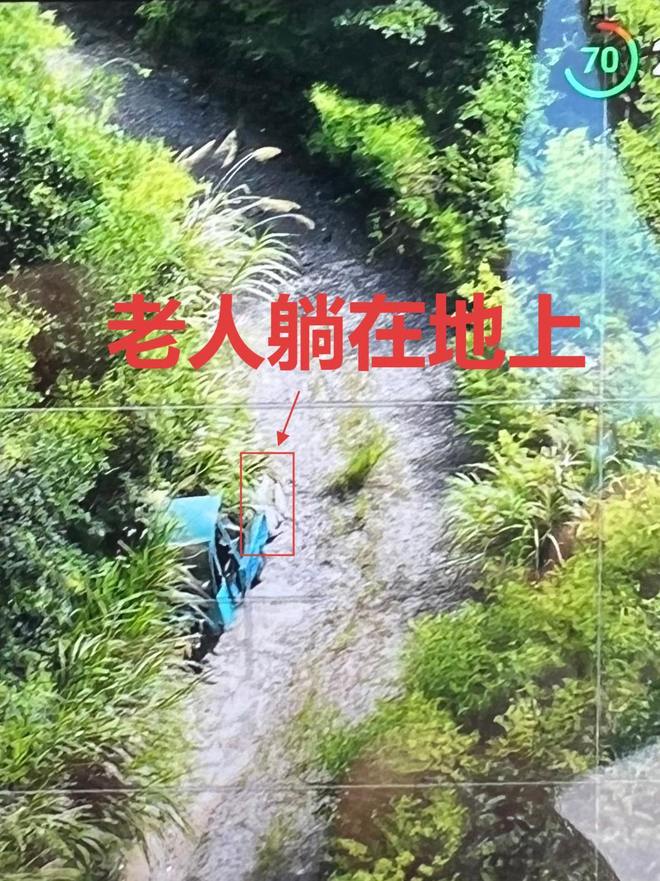上午9时16分,在无人机升空18分钟后,振奋人心的消息传来。在距离后溪镇广坞村约1.5公里处的一条偏僻山间小路上,航拍到一辆停着的三轮车。操控员立即拉近镜头,画面清晰显示:一位老人正躺倒在车旁。经确认,这正是失联近14小时的老人。