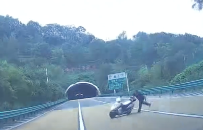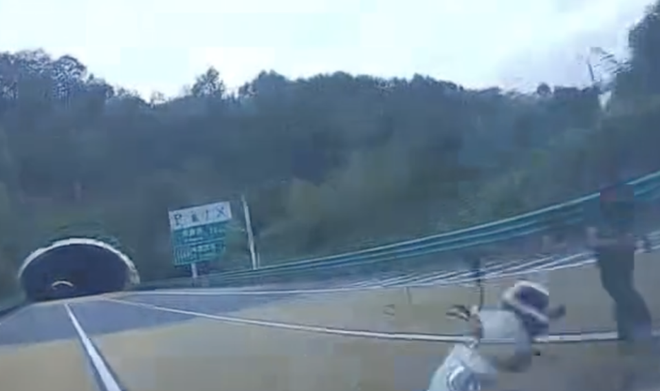 8月27日,有网友发视频称,在陕西境内某段高速公路上,出隧道后有人恶意往驶过车辆上推电动车。驶过车辆的行车记录仪拍下这一瞬间,险些撞上,十分危险。