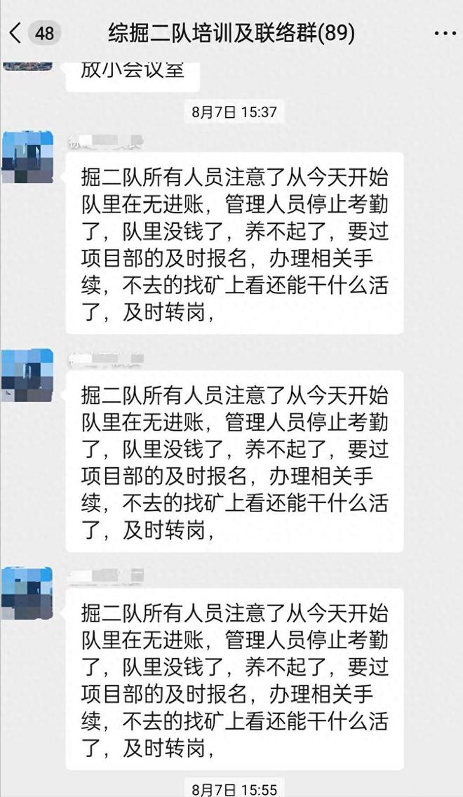 目前在家待岗的一名矿工向记者提供了8月7日下午3时37分的“通知”内容:掘二队所有人员注意了,从今天开始队里再无进账,管理人员停止考勤了,队里没钱了,养不起了,要过项目部的及时报名,办理相关手续,不去的找矿上看还能干什么活了,及时转岗。