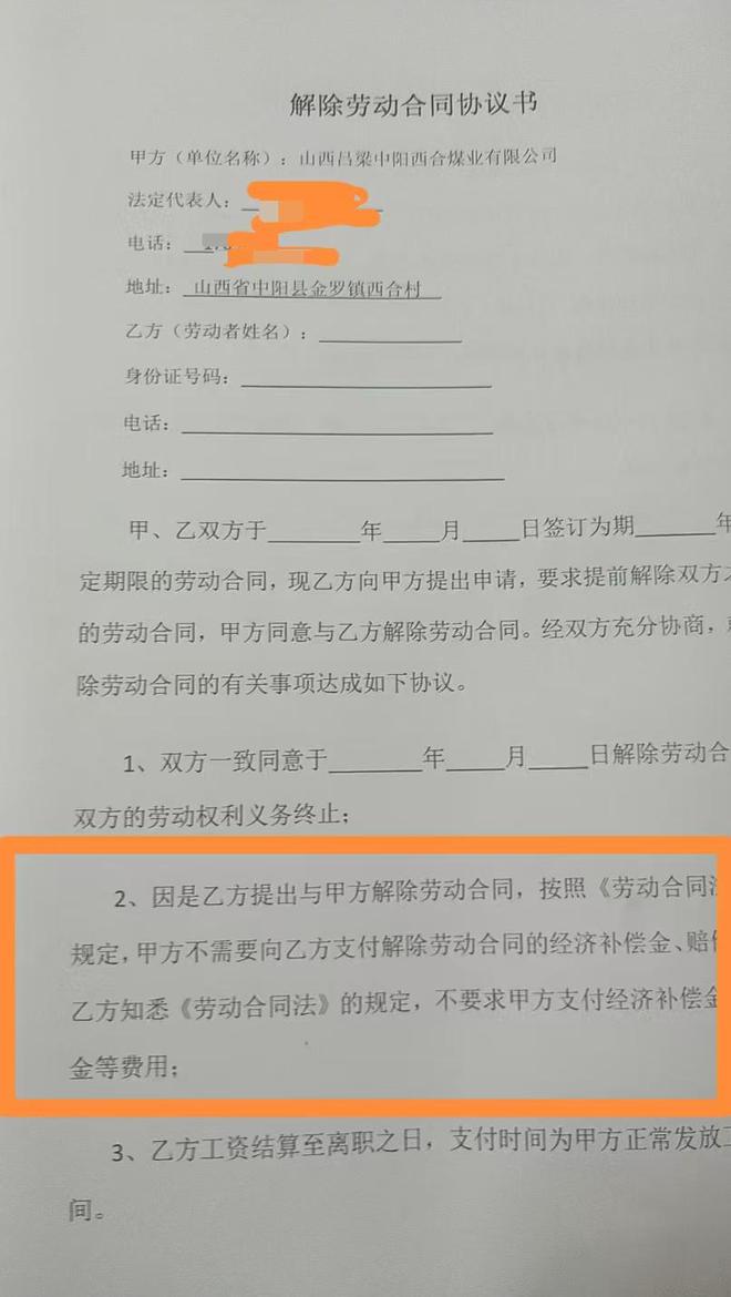 2025年7月,山西吕梁中阳县西合煤矿掘进二队的32名矿工收到通知:矿方以“转入外包工队”为由,要求旷工解除劳动关系,自愿放弃经济补偿金及未补缴社保费用。