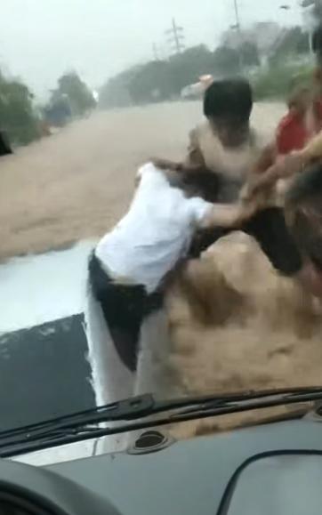 男子激流抡锤砸窗救出被困三人
