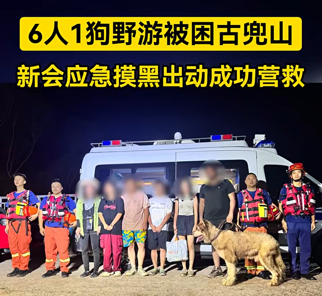 事发于8月3日19时左右,接当事人报警,他们在新会古兜山,一行6人(3男3女)和一条狗野游探险,其中1人和狗掉入10米深坑中,另外5名同伴开展营救后因体力不支一同受困,由于他们没有水、食物和夜间照明装备,加上夜间山里气温骤降,身上衣衫单薄,情况危险。