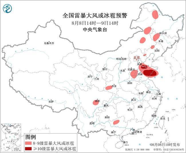 中央气象台发布强对流天气蓝色预警:预计8月8日14时至9日14时,内蒙古东部、东北地区西部、华北东部、黄淮东部等地的部分地区将有8级以上雷暴大风或冰雹天气,其中,河北东南部、山东中南部和北部等地的部分地区将有10级以上雷暴大风,最大风力可达11级以上。