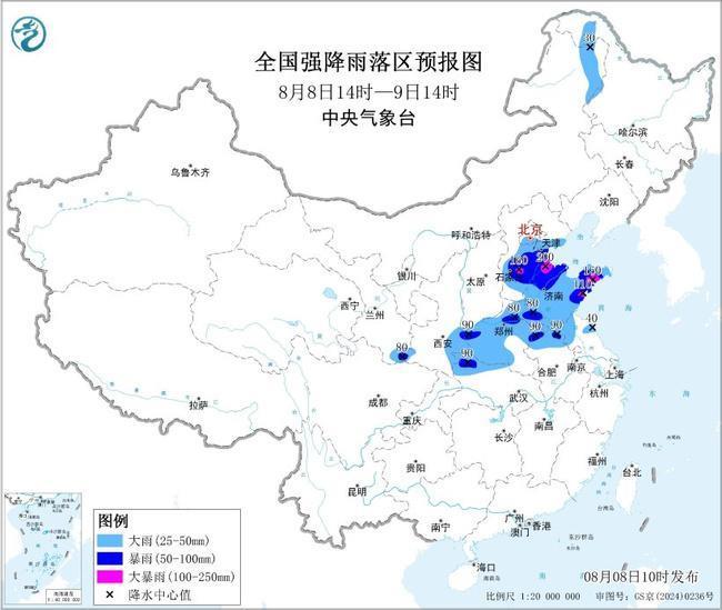 中央气象台继续发布暴雨黄色预警:预计,8月8日14时至9日14时,内蒙古东北部、北京西部和南部、天津中南部、河北中南部、黄淮大部、江淮北部、湖北北部等地部分地区有大到暴雨,其中,河北中南部、山东北部和东部等地部分地区有大暴雨(100~200毫米)。上述部分地区伴有短时强降水(最大小时降雨量20~50毫米,局地可超过80毫米),局地有雷暴大风等强对流天气。