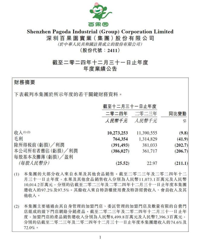 财报显示,2024年百果园营收102.73亿元,同比下滑9.8%,毛利7.6亿元,同比下滑了41.9%,归母利润由盈转亏为-3.86亿元。