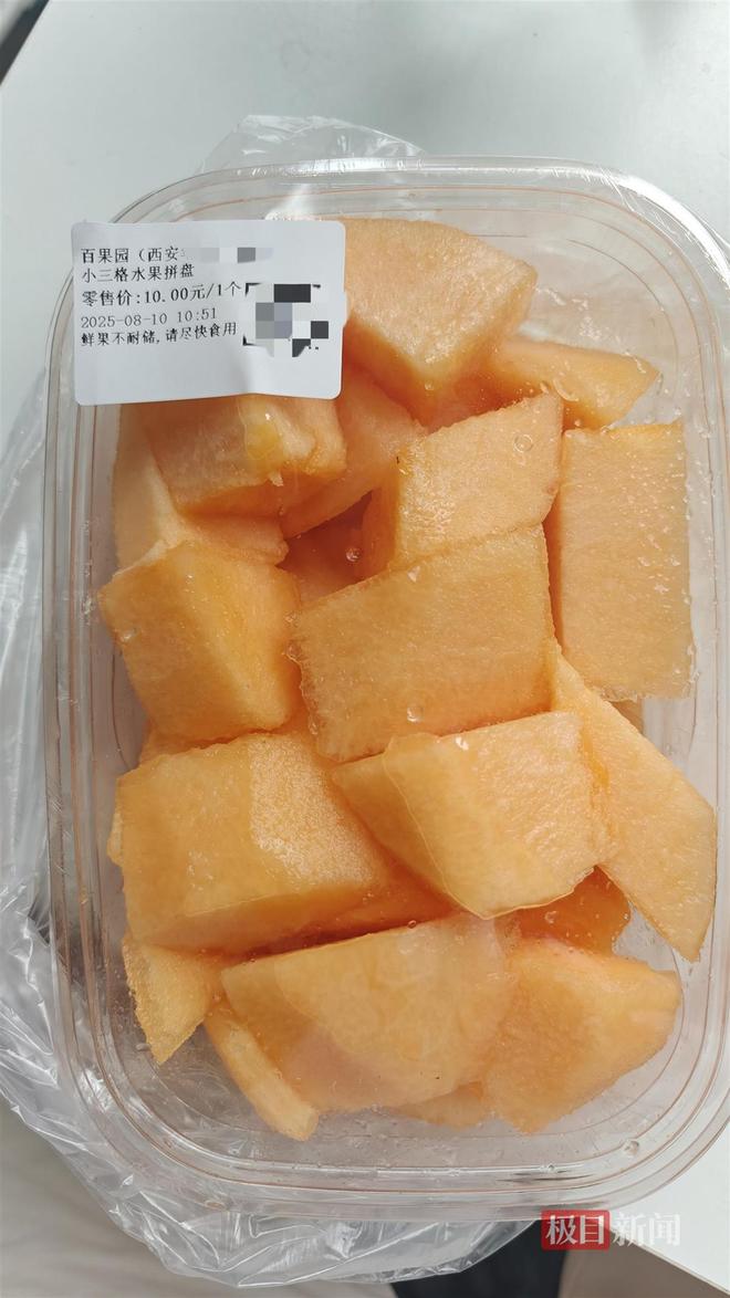 随后,记者在店内以会员价格购买了一份1斤左右的黄皮哈密瓜和一份1斤多的阳光玫瑰(中),共花费28元,其中哈密瓜果切10元,阳光玫瑰18元,果切上还标注有制作时间。而同样的水果,在社区商超的价格约为14元。