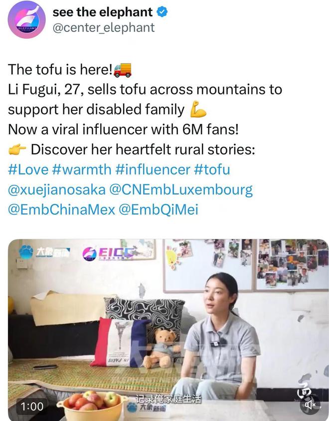 27岁的李福贵,本名李亚云,父母均患智力障碍,爷爷年事已高,奶奶去世后,她扛起一家四口的生计。从推车卖煎饼开始,渐渐扩大“经营范围”,开始了走村卖货的日子。2024年起,她把日常拍成短视频:帮老人晒麦子、给失智母亲扎小辫、为老乡拍照片……没有滤镜、没有脚本,却直击人心。6月27日,大象新闻推出了题为《女子福贵,“硬是把一手烂牌打成了王炸”丨面孔》的独家专访,引起了社会强烈反响与共鸣。中国驻大阪总领事薛剑在海外平台转发视频并向全球介绍“豆腐姑娘”,称“她让世界看到中国乡村的坚韧与温度”。