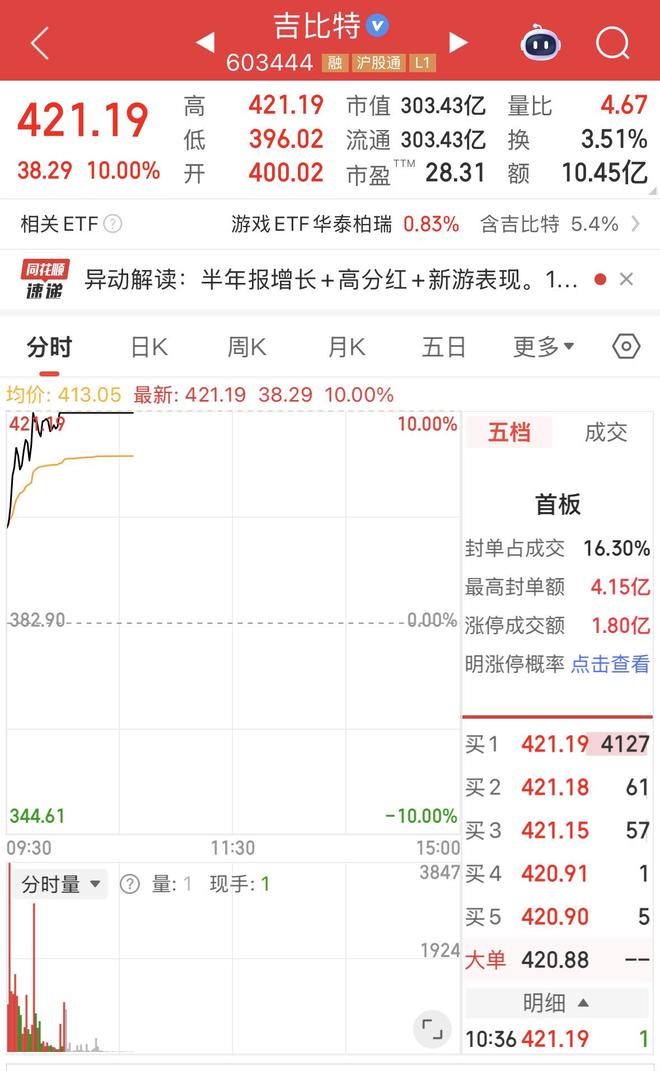 截至发稿,浙版传媒最高触及涨停,中信出版最高涨超4%,旗天科技最高涨超5%,华谊兄弟最高涨超9%。游戏板块中,吉比特涨停,迅游科技、恺英网络、完美世界、巨人网络等个股跟涨。