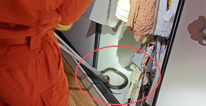 据江西消防消息,近日,江西省景德镇市昌南新区一居民家,一条“臭美”的眼镜蛇偷偷潜入,消防员接警后到场。报警人将消防员带到了一楼的一个衣柜旁,原来,蛇就在这个柜子里。