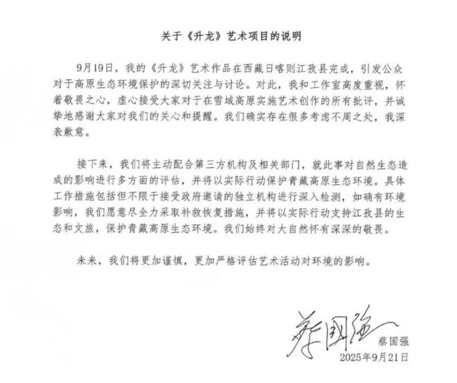 21日凌晨2时许,“云端珠峰”发布情况通报称:日喀则市委、市政府高度重视此事,已成立调查组第一时间赶赴现场核查,后续将根据核查结果依法依规处理。随后,始祖鸟品牌和蔡国强工作室先后就此事致歉。(据9月21日极目新闻)