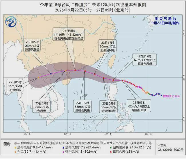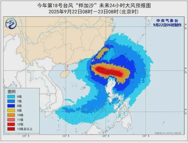 大风预报:22日08时至23日08时,巴士海峡、南海东北部海域、台湾海峡、台湾以东洋面、东海西南部海域、东沙群岛、福建沿海、台湾岛东南部沿海将有7-9级、阵风10-11级大风,其中,巴士海峡、南海东北部的部分海域风力有10-13级、阵风14-15级,台风中心经过的附近海域或地区风力可达14-17级、阵风17级以上。