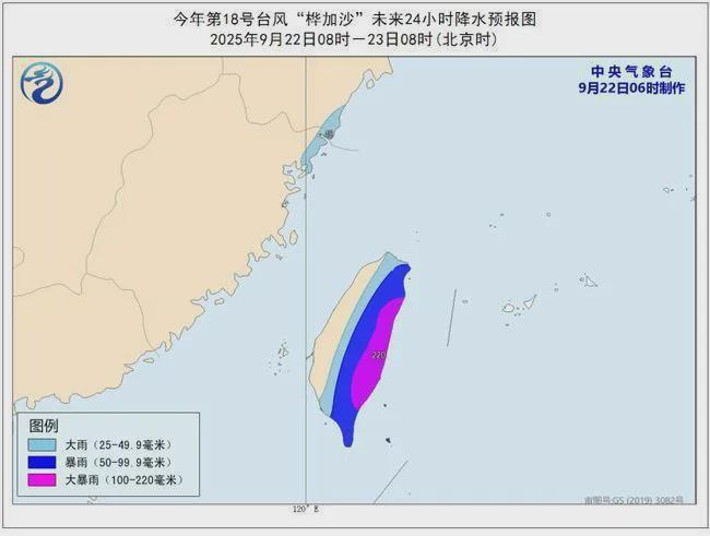 降水预报:22日08时至23日08时,福建东北部和浙江东南部局地有大雨,台湾岛中东部有大到暴雨,台湾岛东部的部分地区有大暴雨(100-220毫米)。