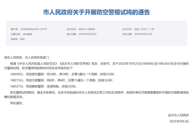 9月23日,武汉市人民政府发布关于开展防空警报试鸣的通告: