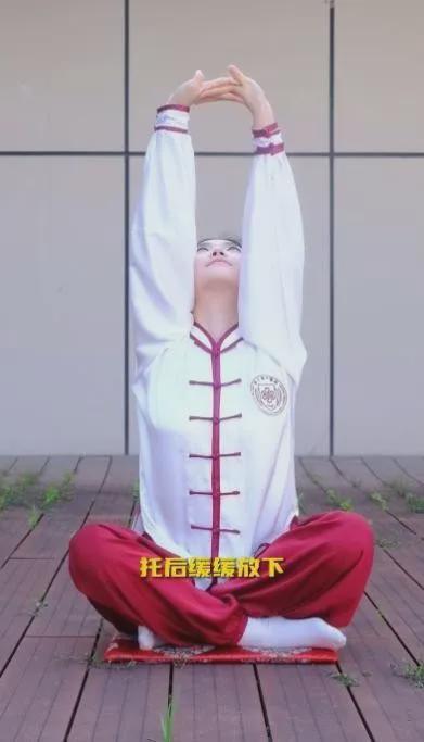 两手掌相搓,用口呵掌心5次,两手指交叉反掌向上托,挺胸抬头,好似向上托举重物一般,后缓缓放下,收于头顶,静止2秒,连续上托9次。此式可增强手臂及背部力量,有助于上身经络的疏通,达到形神共养的效果。