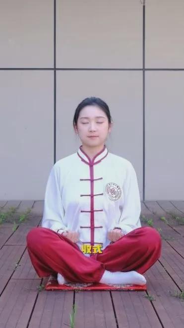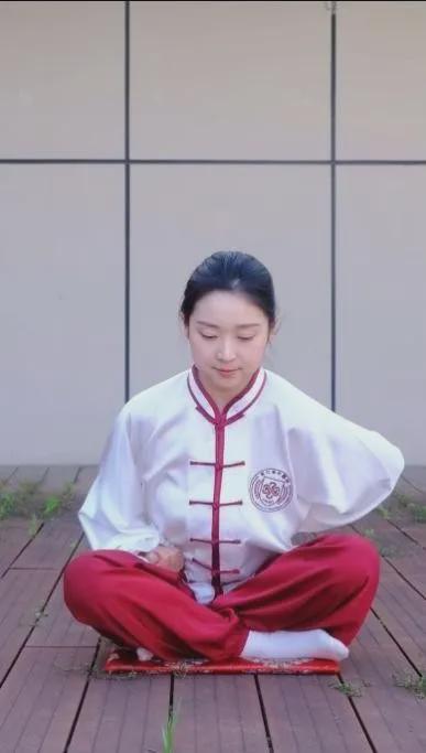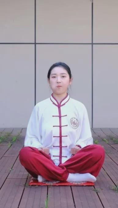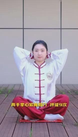 盘膝坐式,腰脊正直,两手握拳置于大腿根部,闭目静坐3-5分钟。闭口,上下牙齿相扣作响十六次,有固齿功能。食指叠于中指之上,两手掌掩在两耳处,两食指用力滑下,弹在后脑上,如击鼓,谓之“鸣天鼓”,弹击24次,可宁气安神健脑。