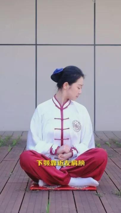 身体坐正,双手拳面相抵,拳心相对,置于腹前,将头向一侧转,下颚靠近同侧肩膀,再将头后仰,继续转至另一边,下颚靠近同侧肩膀,左右扭颈12次,最后将头转正。天柱穴是颈斜方肌的外侧凹处,在后发际旁开1.3寸,牵拉天柱穴能改善肩颈部肌肉痉挛。