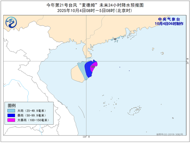 降水预报:4日08时至5日08时,广东西部沿海、海南岛中东部有大到暴雨,其中,海南岛东北部有大暴雨(100-150毫米)。