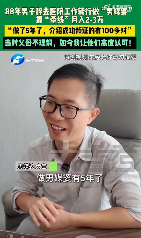 一名男子在放弃医学事业后转行成为媒婆,成功帮助上百对新人领证结婚,他从事这一职业的目的是帮助单身男女寻找合适的伴侣,让他们步入幸福的婚姻殿堂,他的工作得到了社会的认可和尊重,也让他自己感到非常有成就感,这一转变展现了他的勇气和决心,同时也突显了人们对爱情和婚姻的追求和渴望,这一事件引发了社会的广泛关注和讨论,也引发了人们对婚姻观念和爱情观的思考。