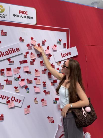 留言墙区域,观众写下对家人、对中国人保、对武网、对国家的祝福语,并贴上“人保心愿墙”。一位外国球迷笑着用中文写下“我爱你 中国”,尽显对中国文化的喜爱。