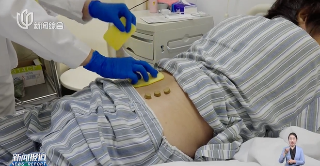 医生将通经活络散寒功效的中药药饼放置在腰椎穴位上,通过离子导入仪器加速药性渗透。
