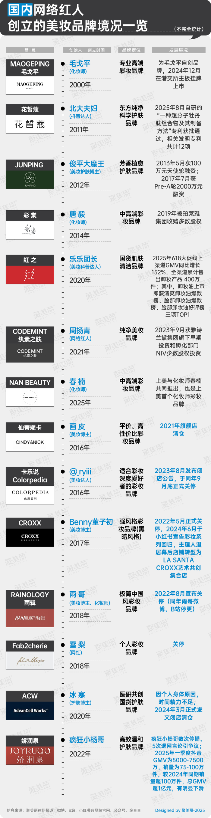 上图已经揭示了一些网络红人创立的美妆品牌发展境况,可以看到,有多个品牌已关停、闭店。目前留下来的则有周扬青的CODEMINT纨素之肤(下称:CODEMINT)、俊平大魔王的JUNPING、乐乐团长的红之、毛戈平/唐毅等化妆师的毛戈平/彩棠,细分来看,无外乎KOL(网红)、专业人士这两类。