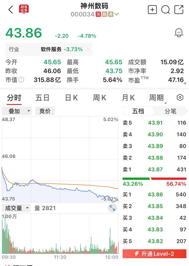 10月11日,神州数码股价以43.06元/股收盘,市值为315.88亿元。