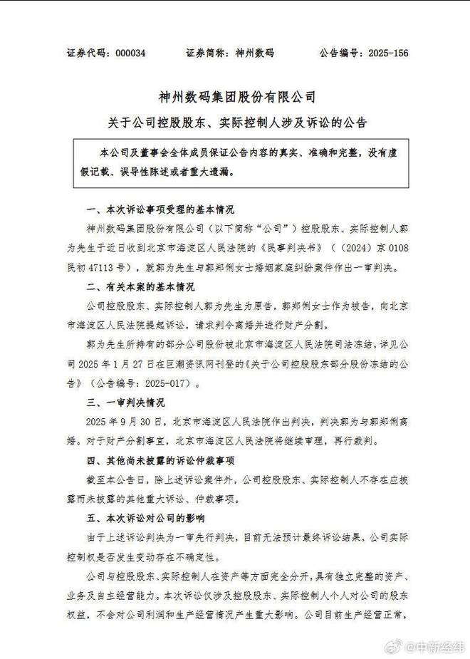 扬子晚报网10月12日讯(记者 范晓林 薄云峰 实习生魏静萱)神州数码10月10日晚发布公告称,公司控股股东、实际控制人郭为近日收到北京市海淀区人民法院的《民事判决书》,就郭为与郭郑俐的婚姻家庭纠纷案件作出一审判决。