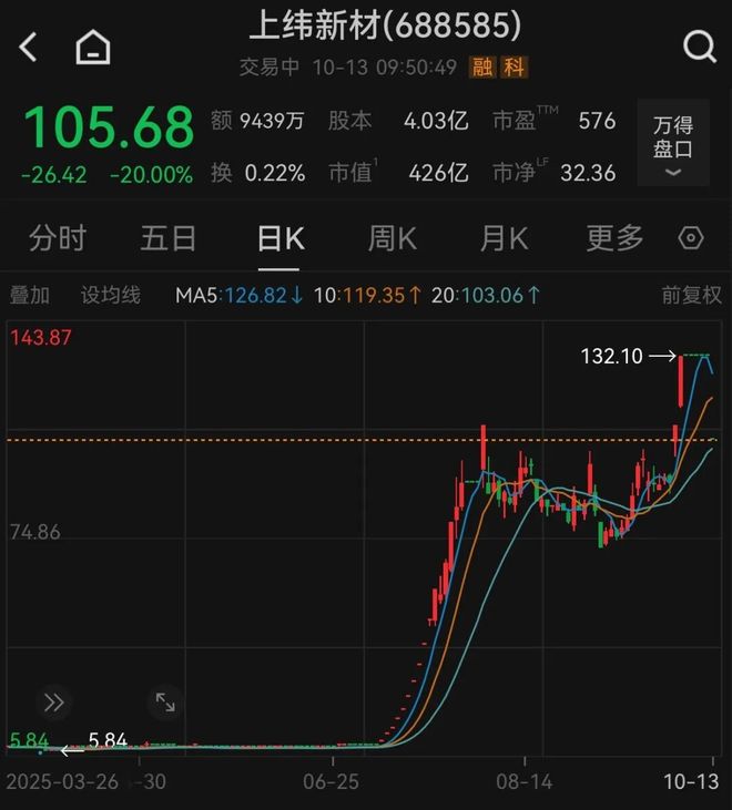 10月13日,上纬新材复牌20%跌停,该股今年来涨势强劲,此前年内最大涨幅超20倍。