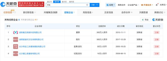 天眼查任职信息显示,目前,李锐共关联4家企业,包括湖南看见网络科技有限公司、湖南喵爸村文化传媒有限公司等,均为注销状态。此外,“村长李锐”已被多方申请注册为商标,申请人包括湖南快乐村长文化传媒有限公司、自然人郭某等,国际分类涉及广告销售、办公用品等,当前部分商标已注册成功。
