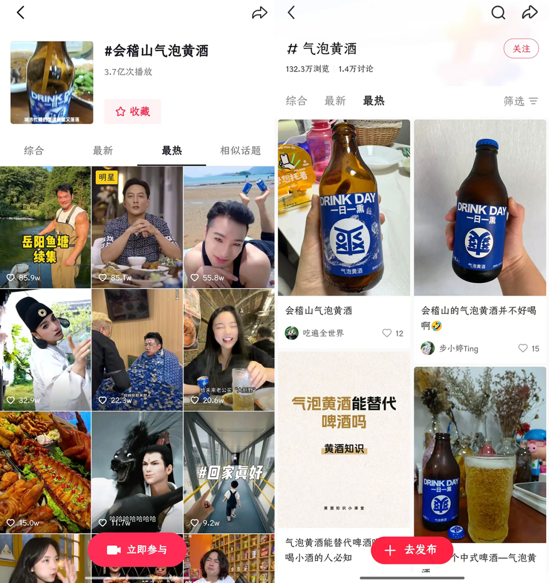 搜索”气泡黄酒“结果 图片来源:抖音、小红书App截图